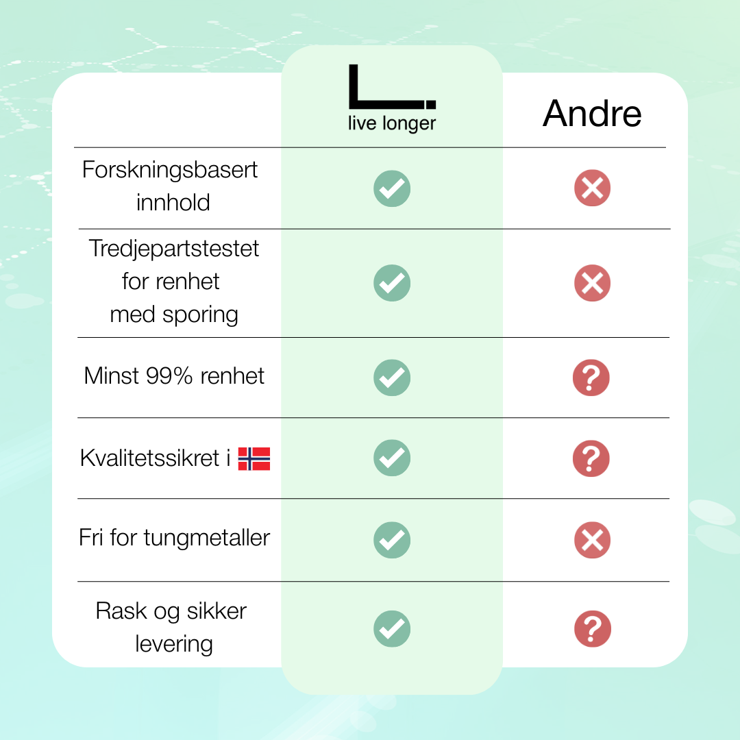 See how we stand out from the usual NAD⁺ brands – with a focus on purity, proven quality and a reliability you can trust. With us, it’s not just about offering a product, but delivering a standard you can truly trust.
